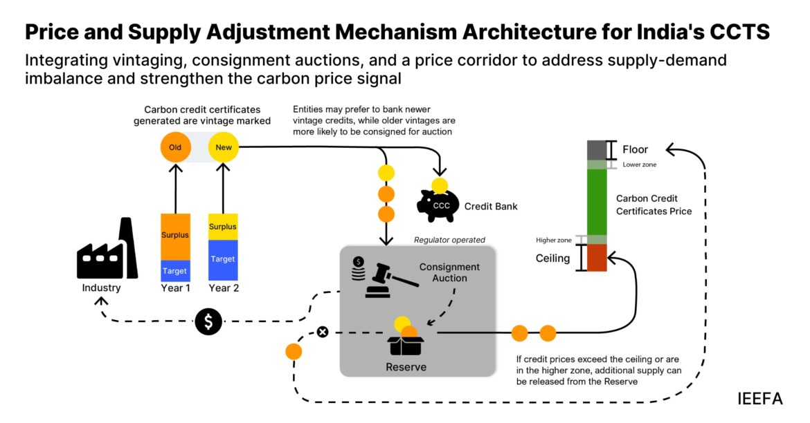 India’s upcoming Carbon Credit Trading Scheme (CCTS) is designed to reward facilities that beat emissions intensity targets while allowing emissions to grow alongside the economy, but this flexibility also creates a risk of early oversupply of credits and weak carbon prices. Past experience from India’s Perform, Achieve and Trade (PAT) scheme and international markets such as the EU ETS, Alberta, Australia and California shows that if you do not control surplus early, prices can collapse, investment signals weaken, and later reforms become politically difficult and more disruptive. To avoid that, India should embed a Price or Supply Adjustment Mechanism (PSAM) from the start: a transparent, rules-based way to adjust credit supply when prices are too low or too high, without relying on ad hoc interventions. The proposed PSAM for CCTS would work through three tools suited to India’s current institutions: consignment auctions (to enable orderly intervention in supply while preserving firms’ rights over their credits), vintage-based credit rules (to limit the long-term buildup of old surplus without confiscating it), and a price corridor (to trigger supply tightening when prices crash and easing when prices spike). Introducing these mechanisms early would help maintain credible, investable carbon prices, build predictability for industry, and reduce the likelihood of future market shocks. In doing so, India can position the CCTS not just as a compliance tool, but as a durable industrial policy instrument that supports both competitiveness and decarbonisation.